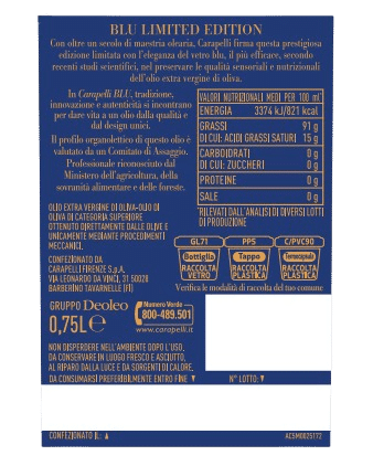 La bottiglia in vetro blu nasce da una scelta consapevole e innovativa. Secondo recenti studi condotti dall’Istituto Nutrizionale Carapelli in collaborazione con l’Università di Perugia, il vetro blu è il più efficace nel preservare le caratteristiche organolettiche e nutrizionali dell’olio extra vergine di oliva.